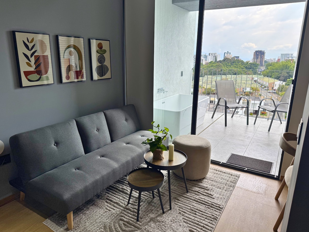 🌿 Wake up surrounded by green mountains in the best location of Ibagué 🌿 Stay in a modern, cozy studio on Calle 60, the city’s Golden Mile. Best Restaurants and malls like La Estación and Acqua are steps away, Multicentro just 10 min. Enjoy panoramic views, a fully equipped kitchen, free parking, and bring your pet 🐾. Perfect for couples or business trips—come explore Colombia’s Musical Capital! 🎶