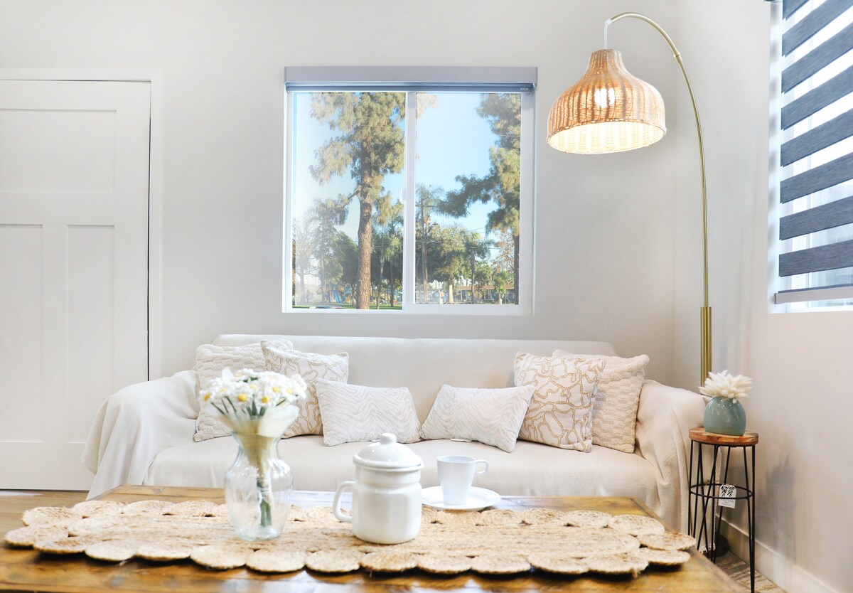 Slip into a quiet, private stay that feels tucked away yet close to everything. This cozy space is designed for rest, simplicity, and easy evenings after a full day out. - Queen bed with Nectar mattress - Wifi and 75” Smart 4K TV - Full Bathroom, Kitchenette and Dining - Central heating & cooling (shared system) - EV charger (220V) available on request - Located near the 405 and 55 freeways - 20 minutes to Disneyland - 10 minutes to the beach and shops Feels easy to arrive—and easy to stay!