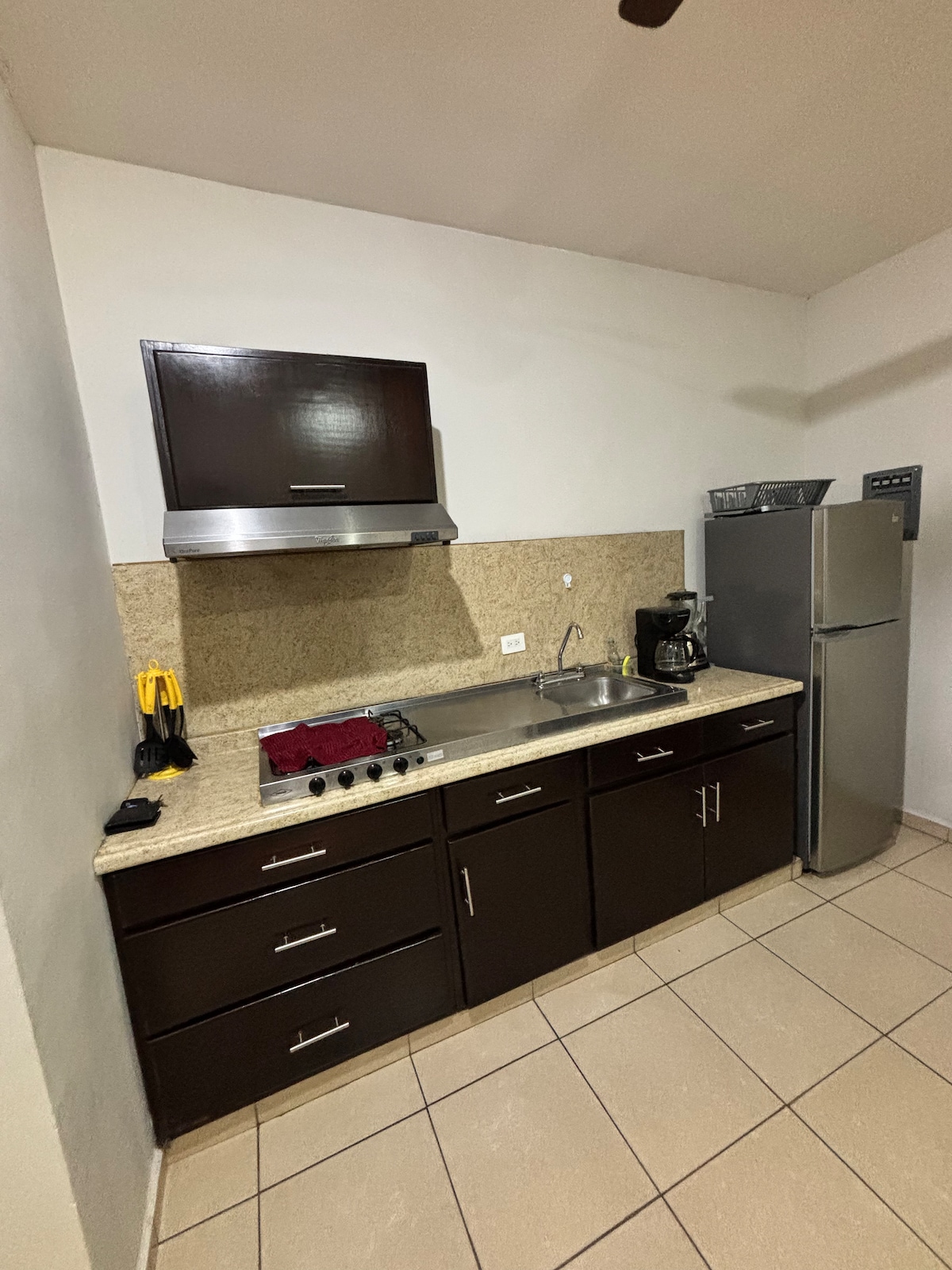 Απολαύστε αυτό το κατάλυμα στον επάνω όροφο. Άνετο, ήσυχο και κεντρικό. Διαθέτει ένα υπνοδωμάτιο με διπλό κρεβάτι, κλιματισμό, τηλεόραση, συρταριέρα, ντουλάπα και ιδιωτικό μπάνιο, ένα άλλο δωμάτιο με μικρή κουζίνα, ψυγείο, ηλεκτρική σχάρα, κεντρικό μπαρ, 2 ψηλά καθίσματα και μπαλκόνι.