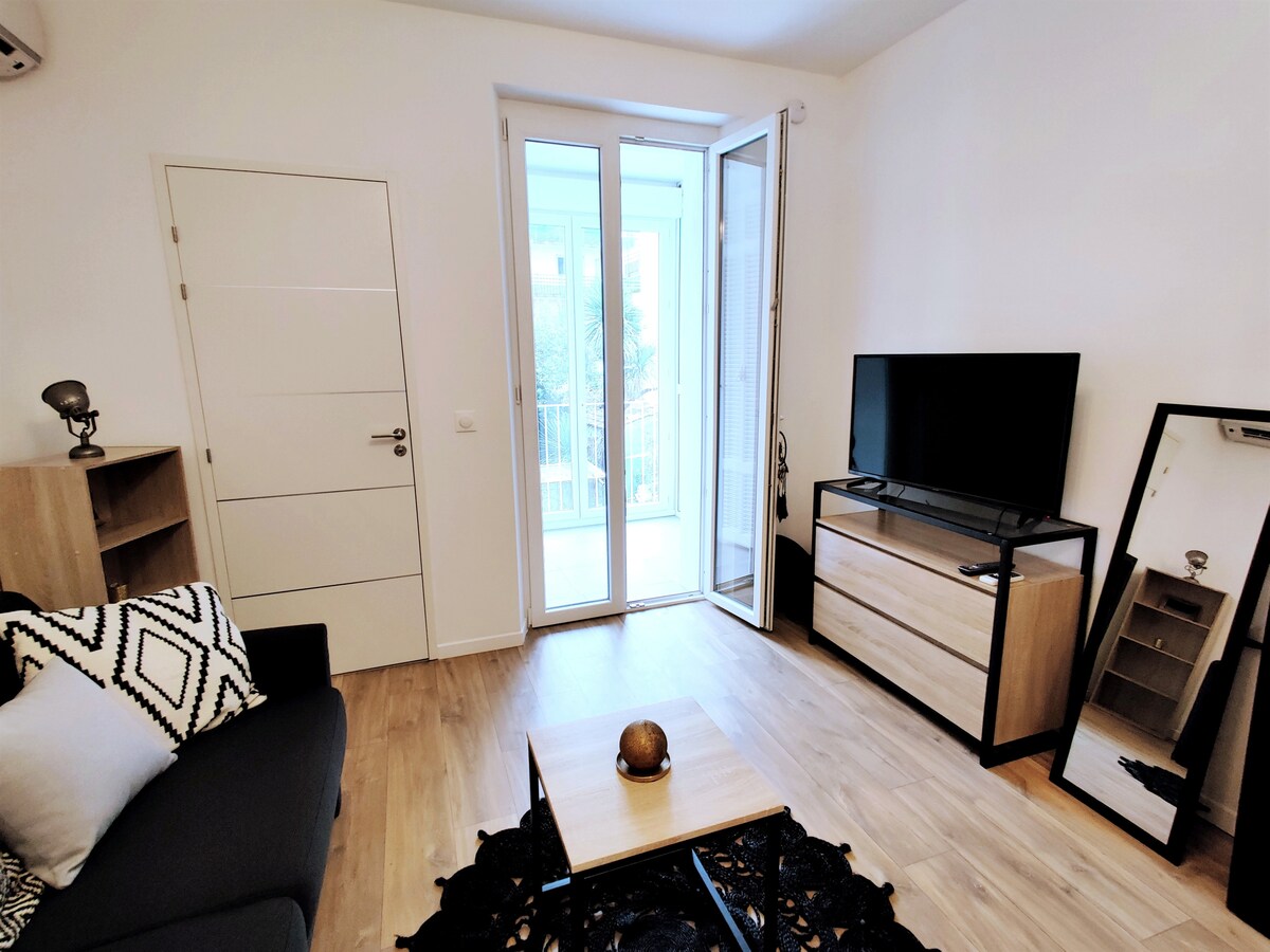 Studio refait à neuf en 2020, situé en plein centre ville de Cagnes-sur-Mer, à quelques pas de toutes commodités. Décoration de style industriel. Équipé d'un canapé convertible de marque française, il dispose d'un matelas de 15cm d'épaisseur (remplacé en août 2025) L'appartement est au 1er étage (sans ascenseur). La gare se situe à 5 min à pied. Vous pourrez rejoindre les plages en une vingtaine de minutes à pied ou en 5 min en voiture.