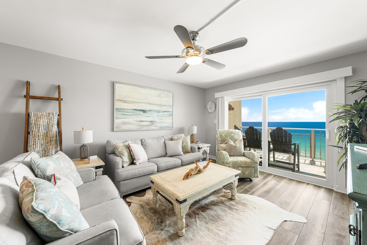 Boasting infinite Gulf views, an open floorplan, and elegant touches throughout, this deluxe, beachfront condo is guaranteed to please even the most discerning guests. The great room boasts a fantastic, full kitchen with stainless steel appliances and counter seating for three. Enjoy more formal meals together at the indoor table for six or al fresco on your furnished balcony. The cozy, sunlit living area includes a gas fireplace and a wall-mounted, flatscreen TV, while the sliding glass doors open the entire space up to the balcony. And for sleeping arrangements, this condo features three comfortable bedrooms including a "mermaid-friendly" kids' room. Guests will also enjoy access to a variety of on-site amenities including a fitness room, a seasonally-heated pool, and a hot tub.