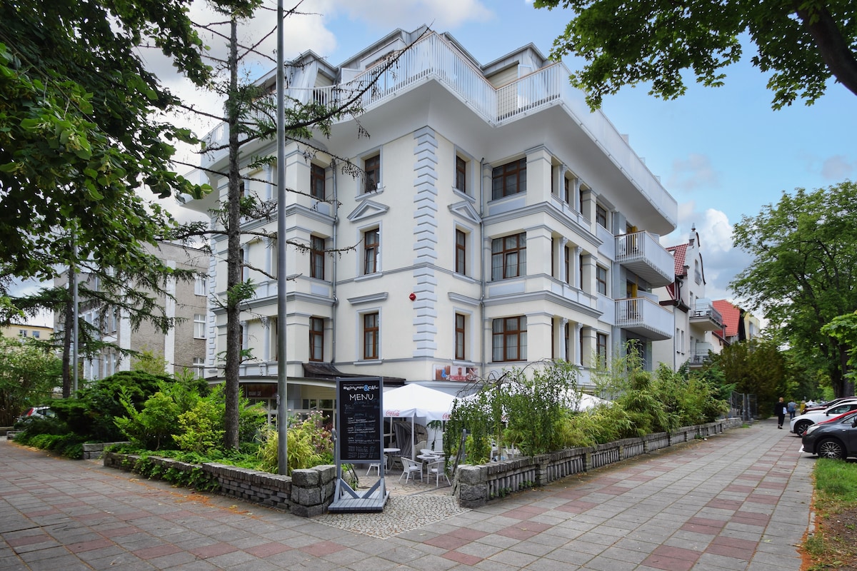 Nowo wyremontowany budynek, w stylu industrialno-loftowym. W 2023 roku przeszedł generalny remont i przebudowę. Bezkonkurencyjna lokalizacja- 80 metrów od promenady i wejścia na plażę. Spokojne i klimatyczne miejsce w wysokim standardzie. Jako nieliczni oferujemy noclegi z 2 lub 3 posiłkami w zależności od terminu pobytu. Na nasze obiady przychodzą goście z całego Świnoujścia. Chcą zjeść smacznie i tanio.