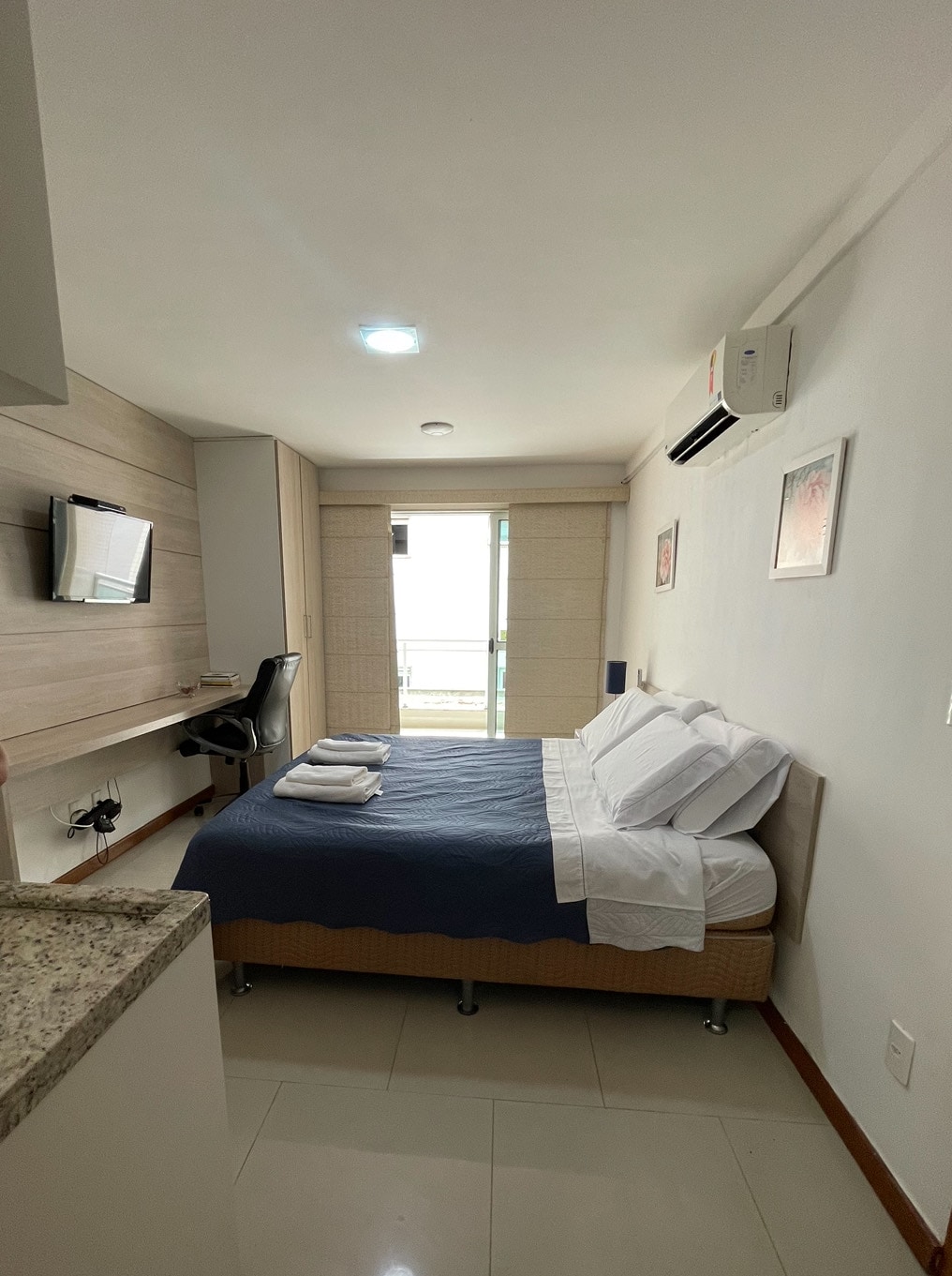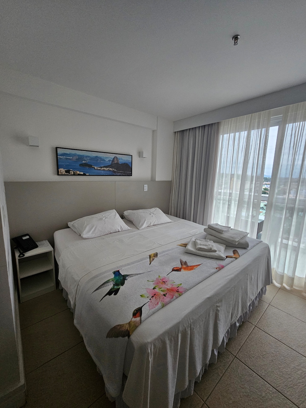 Διαμέρισμα με θέα στη θάλασσα, που βρίσκεται στον 13ο όροφο του ξενοδοχείου Ramada, Imbetiba. Διαθέτει δύο μονά κρεβάτια (μεγαλύτερα από ένα κανονικό μονό κρεβάτι). Το δωμάτιο διαθέτει μπάνιο με τουαλέτα έξω, τηλεόραση LED 40 ιντσών, Wi-Fi, πάγκο εργασίας, καρέκλα, ντουλάπα, νεροχύτη κουζίνας, μίνι μπαρ, φούρνο μικροκυμάτων, καφετιέρα και τοστιέρα. Διαθέτει μπαλκόνι με θέα στη θάλασσα με τραπέζι και δύο καρέκλες. Βρίσκεται 400 μέτρα από τη βάση της Petrobras και την παραλία.