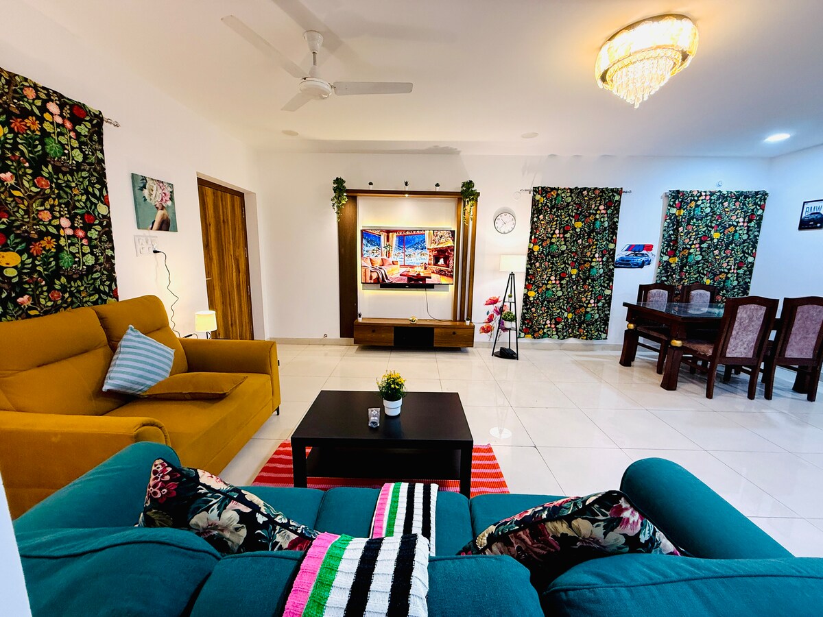 Relax with the whole family at this peaceful place to stay. The impressive Garden View welcomes you to a 3,500+ square-foot layout. Once inside, the huge SONY 4k TV in the hall makes it perfect for Movies. Three AC bedrooms, 1 Non AC Bedroom, and 1 AC in Living area, with a Surprised spacious sit-out area and Puja room.
