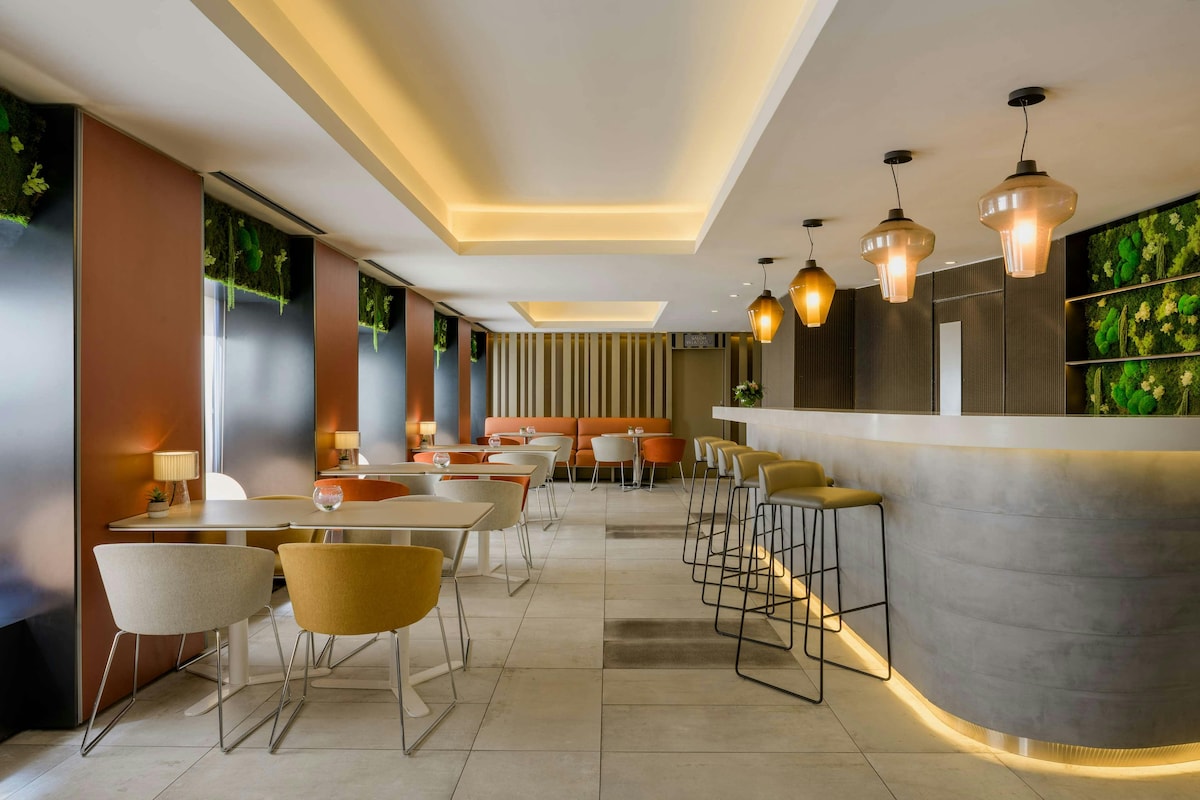 Relax in this stylish 1-bedroom apartment featuring air conditioning, a modern bathroom with shower, and a well-equipped kitchen with stovetop, refrigerator, dishwasher, and kitchenware. Enjoy a comfortable seating area, wardrobe, flat-screen TV, and stunning city views within a spacious 25 square meter layout. Take advantage of the seasonal pool, open from mid May to September, for a refreshing stay.