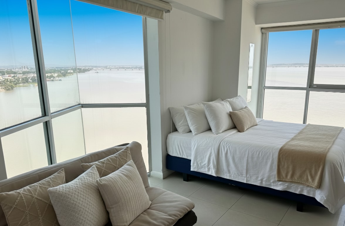 Modern suite in Riverfront 2 – Puerto Santa Ana, with river views, ideal for leisure or business trips. Features a very comfortable King-size bed and a sofa bed in a modern, bright space. Includes Smart TV 55” in the living room and 40” in the bedroom, Netlife Wi-Fi, air conditioning, fully equipped kitchen, washer, and 24/7 security. 🏊💪 Pool and gym available according to building hours. 🚗 Parking included at Santana Park, across the street. Located next to Wyndham Garden Hotel.