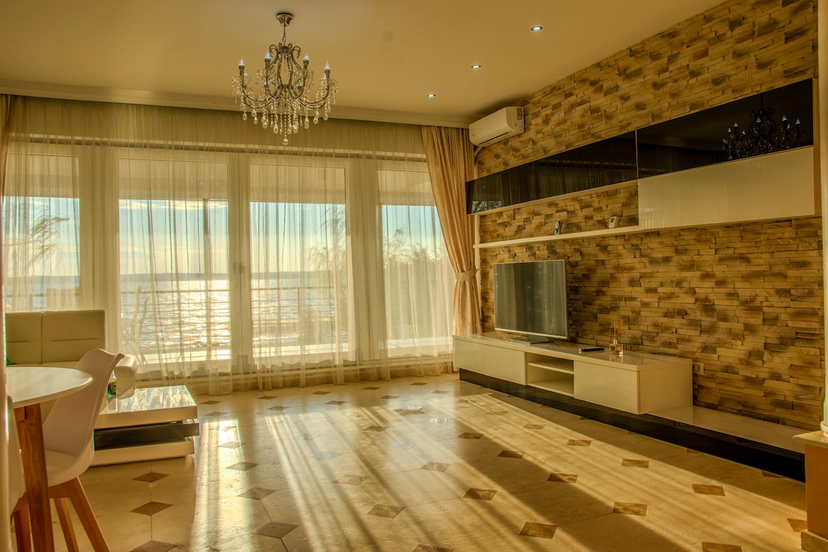 Ευρύχωρο διαμέρισμα πάνω από 90 τ.μ. με πλήρη θέα στη θάλασσα, που συνδυάζει πολυτέλεια, άνεση και χαλάρωση. Ο χώρος διαβίωσης περιλαμβάνει σαλόνι, τραπεζαρία και πλήρως εξοπλισμένη κουζίνα ανοιχτού τύπου, ενώ το υπνοδωμάτιο προσφέρει εκπληκτική θέα στη θάλασσα. Ιδανικό για 4 επισκέπτες, το διαμέρισμα διαθέτει πολυτελείς παροχές και κομψή ατμόσφαιρα δίπλα στη θάλασσα. Οι επισκέπτες απολαμβάνουν επίσης δωρεάν Wi-Fi για να παραμένουν συνδεδεμένοι καθ' όλη τη διάρκεια της διαμονής τους.