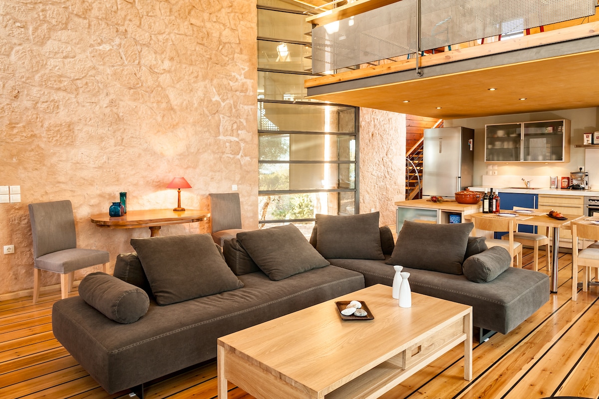 The villa has beautiful views of Marathi and Souda bay next to sandy beaches. It is close to restaurants and local tavernas all on the seafront with great views. You’ll love the outdoor open space, the natural ambiance and the light. The villa is an ideal place for families with children. Luxuriously cool the villa has a striking modern look set in large private grounds only 200 meters from the fantastic golden beaches and crystal clear waters of Marathi bay. Short term rental reg.AMA: 218312
