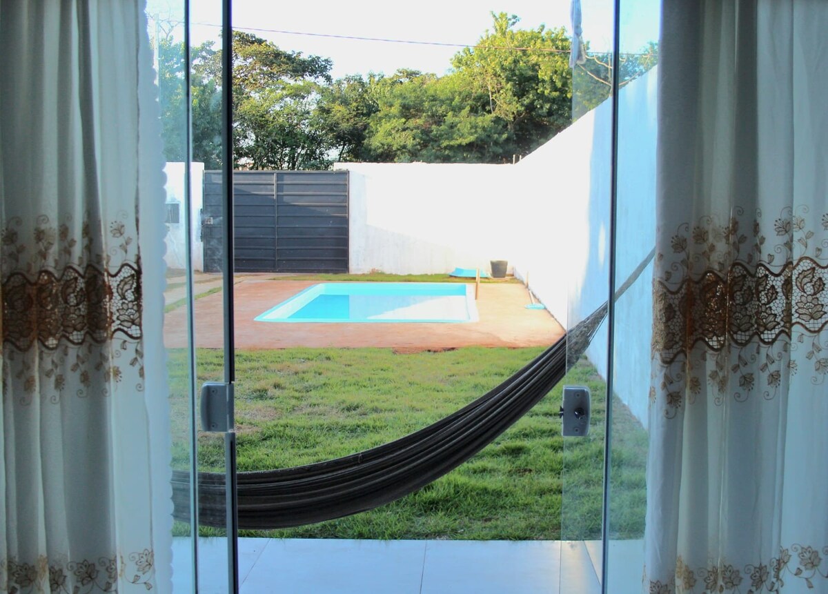 Αφήστε πίσω κάθε έγνοια με αυτόν τον ευρύχωρο και ήσυχο χώρο, σε αυτήν την όμορφη πόλη. Προσφέρουμε νέο και άνετο σπίτι για τη διαμονή σας, με πισίνα, γκουρμέ χώρο με μπάρμπεκιου, κουζίνα, φούρνο μικροκυμάτων, φούρνο και έναν όμορφο πάγκο, 1 κοινόχρηστο μπάνιο. Προσφέρουμε 2 σουίτες, 1 διπλό, 1 σουίτα με 2 μονά κρεβάτια (και τα δύο δωμάτια ενώνουν ή χωρίζουν τα κρεβάτια) 2 μονά στρώματα. Προσφέρουμε κλινοσκεπάσματα και μαξιλάρια. Βρίσκεται λίγα λεπτά από το Pq do Japão. Φιλοξενούμε έως και 6 άτομα.