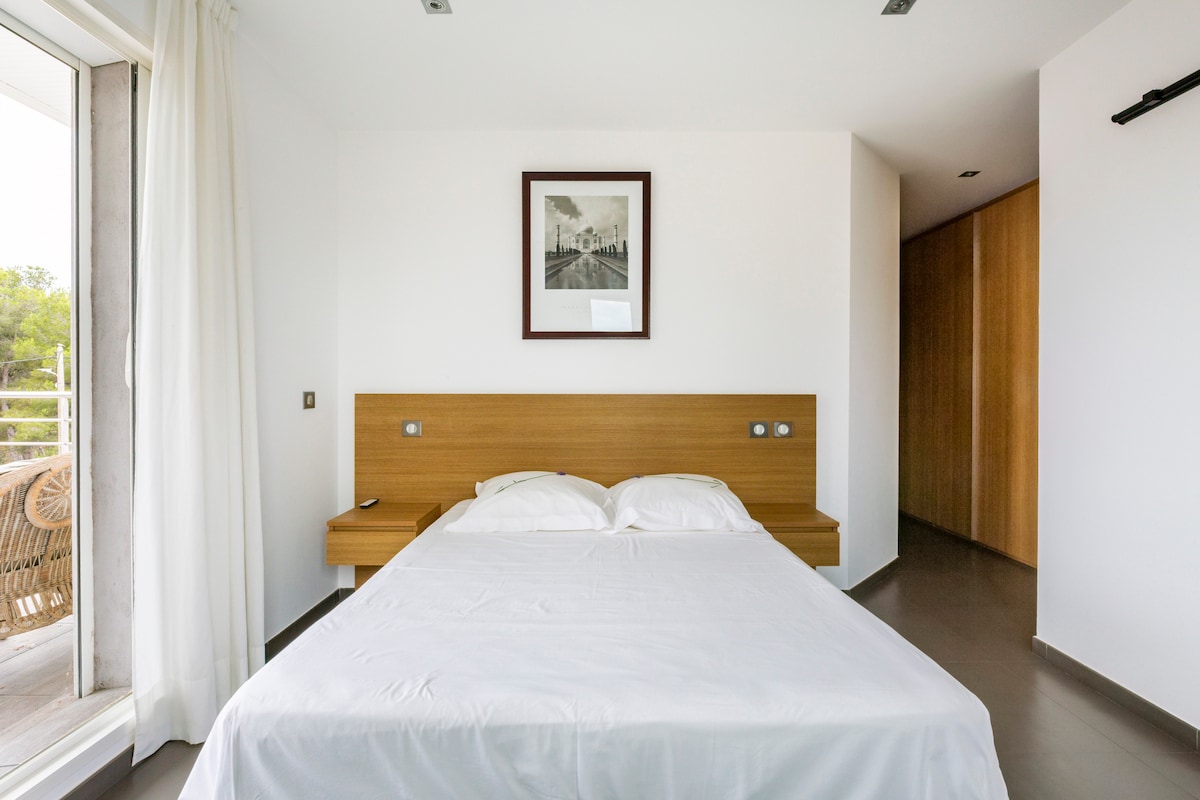 Dans maison contemporaine, chambre 2 personnes donnant sur la terrasse de la piscine, avec vue imprenable sur le cap Canaille, la mer et le château. Port accessible en 15 mn à pieds par les petites ruelles pittoresques. Le stationnement des véhicules se fait en haut de la maison, et vous aurez la possibilité si besoin d'un parking privé. Nous allons également chercher nos locataires, qui arrivent en train à la gare de Cassis. KITCHENETTE A DISPOSITION