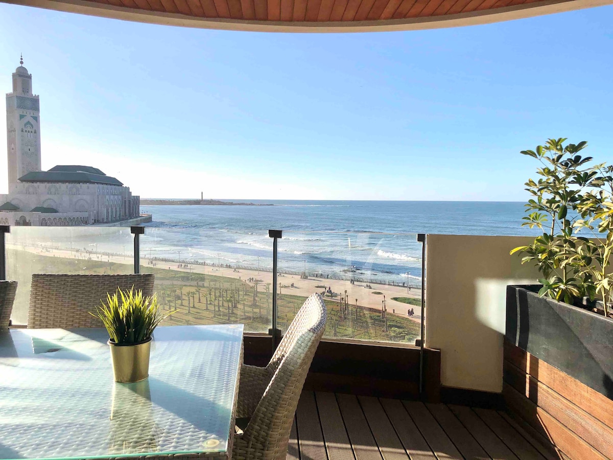 Ευρύχωρο πολυτελές διαμέρισμα – 200 τ.μ. – θέα στην παραλιακή οδό Casablanca Corniche Ανακαλύψτε αυτό το όμορφο, πολύ ευρύχωρο κατάλυμα 200 τ.μ., σε βολική τοποθεσία, πολύ κοντά στο Τζαμί Χασάν Β', με εκπληκτική θέα στο Corniche. Το διαμέρισμα αποτελείται από: • Δύο μεγάλα άνετα υπνοδωμάτια, σχεδιασμένα για μια χαλαρωτική διαμονή. • Δύο μοντέρνα μπάνια, που συνδυάζουν άνεση και λειτουργικότητα. • Ένα μεγάλο φωτεινό σαλόνι, πλήρως εξοπλισμένο με όλα τα έπιπλα που χρειάζεστε για να χαλαρώσετε.