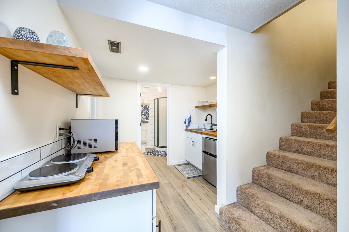 Enjoy a stylish experience in this new ADU style unit. Located in the lower level of a home with continental breakfast. Better than a hotel stay with a comfortable queen mattress and a sofa bed in the bedroom. Living room area complete with a large couch that can also be a bed, a table for four and a reading nook. Cozy up to a wood burning fire in the winter. Small kitchenette for simple meal making. Tile shower in bathroom. Walk to downtown and experience wine tasting and delicious local fare!