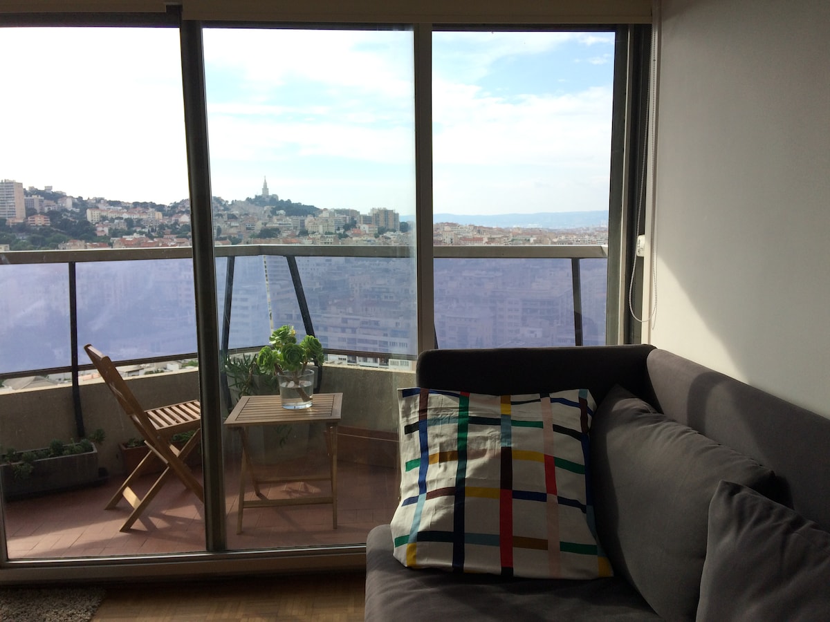Ένα πραγματικό κουκούλι, πολύ ρομαντικό που βρίσκεται στον τελευταίο όροφο με ασανσέρ. Πανοραμική θέα της Παναγίας των Παρισίων και των γύρω λόφων. Το κατάλυμα βρίσκεται στη λεωφόρο Avenue du Prado στο 8ο διαμέρισμα της Μασσαλίας, που θεωρείται μία από τις πιο όμορφες περιοχές της πόλης, κοντά στη θάλασσα με πολλά καταστήματα, εστιατόρια , μπαρ. Κοντά στο Parc des Expositions Chanot και το στάδιο Velodrome. Τρεις σταθμοί του μετρό από τον σιδηροδρομικό σταθμό και το παλιό λιμάνι. Δωρεάν χώρος στάθμευσης. .