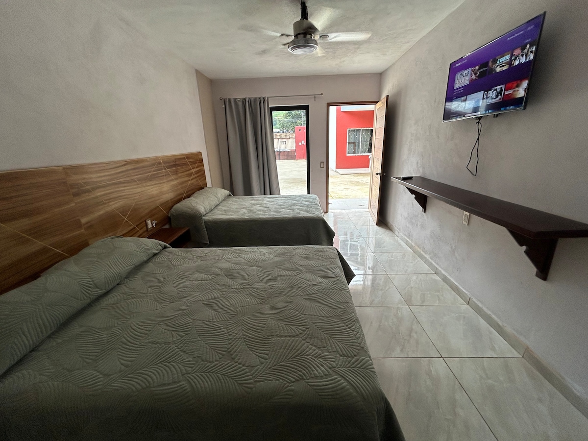 Favor de LEER EL REGLAMENTO adjunto con las fotos. Habitación divida en 2 espacios, comunicados mediante una pequeña terraza con una vista hacia el bosque. Se ubica en el Hostal del Bosque, con acceso a través de los pasillos del edificio de recepción. Espacio 1: • Cama matrimonial • Baño completo con agua caliente Espacio 2: • Cama matrimonial. • Litera individual. **Nota: Los dos espacios comparten un solo baño. No cuenta con cocina, sala, asador ni área de fogata.