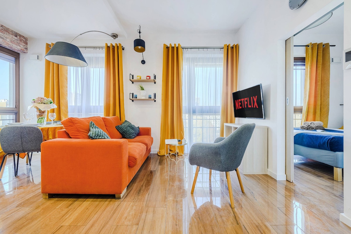 If you want to visit Warsaw and stay at a comfortable place, where you can indulge yourself after a tiring trip… Bingo! This is exactly the place you are looking for! It is perfect for cooking and good movies enthusiasts. At your disposal are large, multimedia TV, DVD, home cinema along with big corner sofa bed in the living room. Kitchen is fully equipped. What is more, bathroom is equipped with bathtub with a shower function. The high bed in bedroom is the KING SIZE bed type.