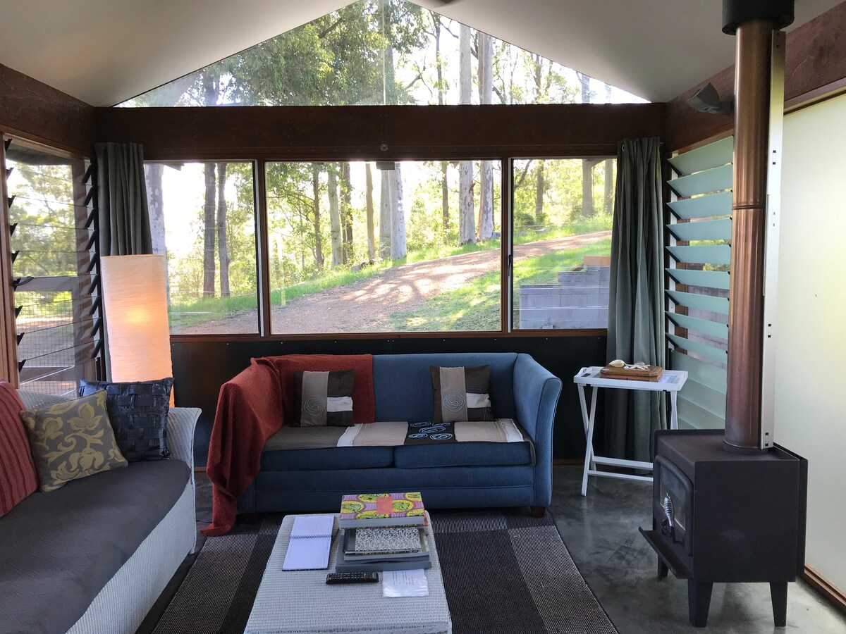 The Bush Boudoir is an architecturally designed, self contained Tiny House. Part glamorous French parlour, part gentleman's club with a bit of rustic bush charm thrown in with all amenities, including good heating for winter and is located in its own separate patch of bush, with a courtyard and fire pit. It has a bedroom, living/dining area, seperate indoor/outdoor bathroom , kitchen for preparing meals and a BBQ. We are 20 mins from Blueys and Boomerang Beach and 15 mins to Iconic Seal Rocks.