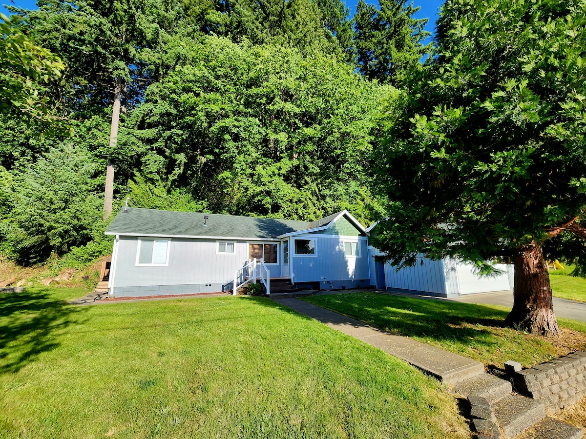 Keep it simple at this peaceful and centrally-located place. Cascade Mountains to the Pacific Ocean, Portland to Seattle . Nestled in the woods, perfect spot for whatever you have in mind. Fish, Hunt, Hike, Ski, Shop, Antiques, Art, Dine, Festivals, Lakes, Kayaking, Breweries, Wineries. Our quest house is about 600 sq ft. & sleeps 4 adults - 1 queen bed and pull-out sectional. Kitchenette complete with coffeepot, mini fridge, microwave, toaster/air fryer oven, dishes, pots and pans & more.