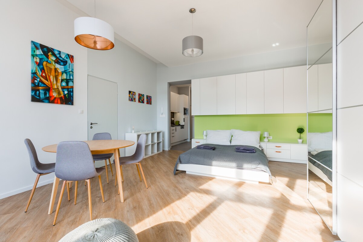 Our 40 sqm apartment is perfect for couples, good friends, or small family. The studio has a private entrance from the community corridor, a dining room, a well-equipped kitchen, a bathroom with shower, a cozy living room and a gallery room with a double bed. A soothing modernist interiors emphasizing comfort, harmonized proportions, and calming color palettes. The studio is by the Danube Riverside, steps from the Margaret Bridge, and surrounded by coffee shops, cafes, and restaurants.