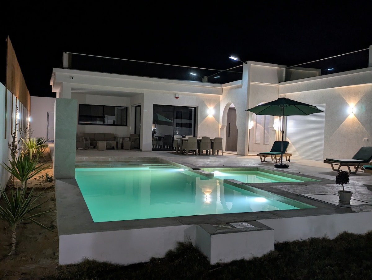 ✨ Ζήστε την Τζέρμπα σε λειτουργία πολυτέλειας και χαλάρωσης ✨ 100% ιδιωτική βίλα με θερμαινόμενο τζακούζι, ιδανική τον χειμώνα για να προσφέρει χαρά στα παιδιά και ρομαντικές στιγμές σε ζευγάρια. Μοντέρνο στυλ Djerba, ανεμπόδιστη θέα στη θάλασσα, κήπος, μπάρμπεκιου, χώρος χαλάρωσης, καλά εξοπλισμένη κουζίνα, 24 ώρες το 24ωρο ασφαλής στάθμευση και υπηρεσία ταξί στον χώρο. Ένα ζεστό και αποκλειστικό περιβάλλον για μια αξέχαστη εμπειρία στη Ντζέρμπα.