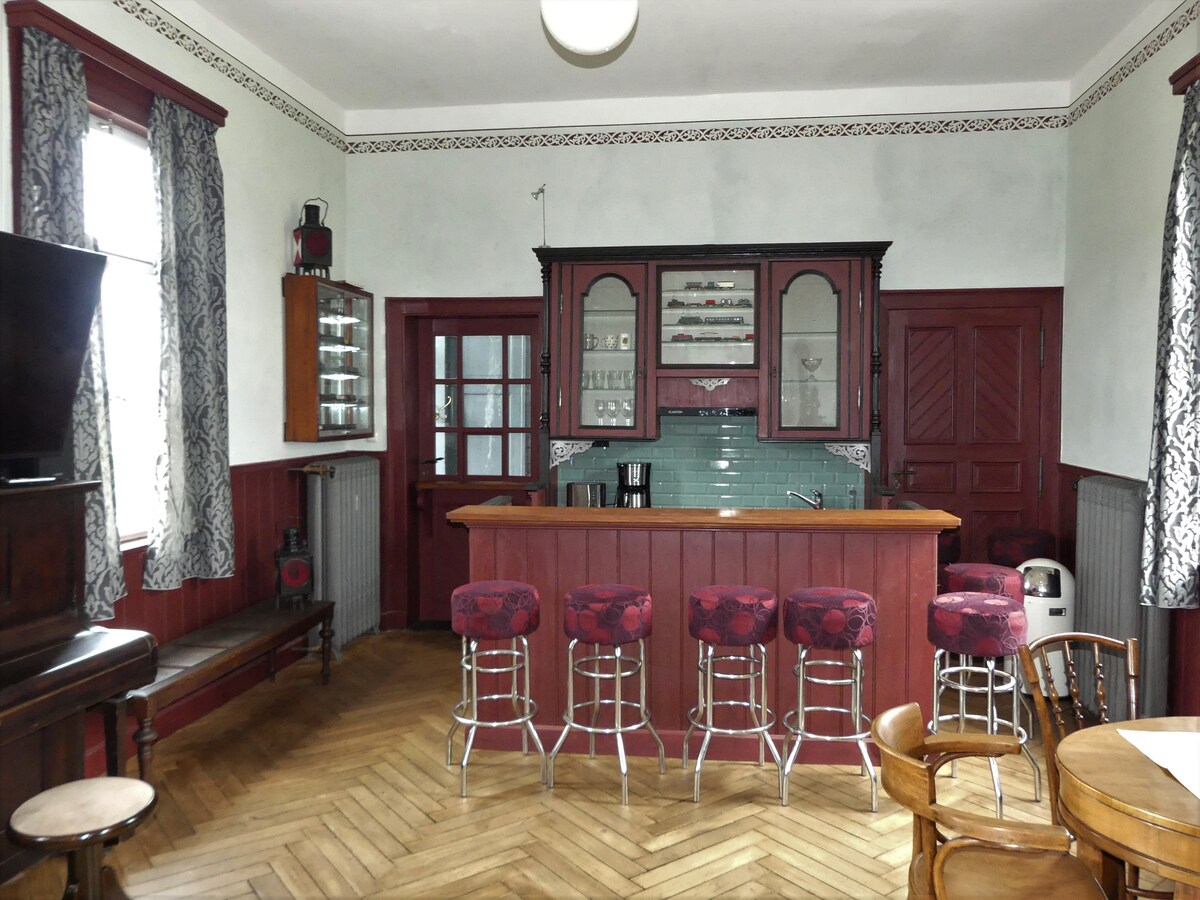 Ισόγειο, ως επί το πλείστον ιστορικά επιπλωμένο, διαμέρισμα διακοπών 60 τετραγωνικών μέτρων στον πρώην σταθμό Wiesenfeld, ένα πρώην κτίριο σταθμού της "Werra-Eisenbahngesellschaft" από το 1892 στη γραμμή από το Coburg στο Bad Rodach. Είναι επίσης δυνατή η μεταφορά με τρένο με ποδήλατο και άμεση σύνδεση.