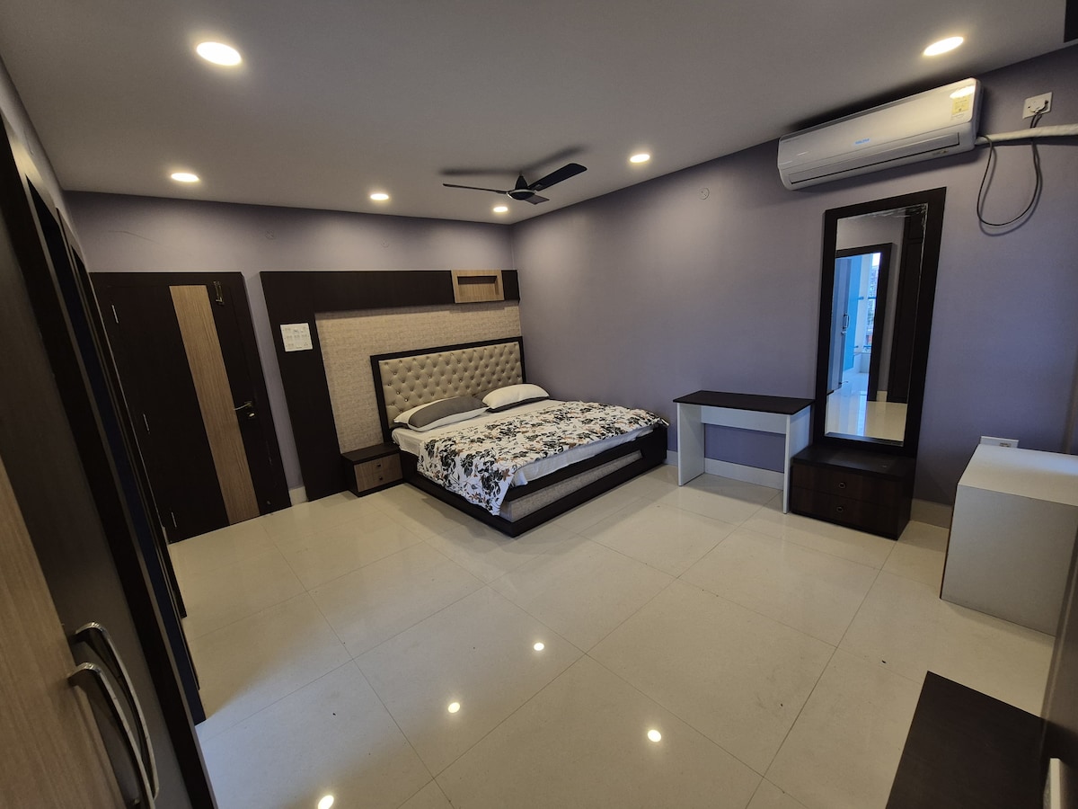Relax in our Carebnb stylish boho-chic apartment with a plush king bed, cozy sofa cum queen bed for 2, full kitchen, and a cute bathroom. Enjoy AC, Wi-Fi, smart TV, balcony, and private parking. The master bedroom offers a king-sized bed for 2, layered with premium linens, warm lighting and a cozy recessed window cove. Cook like a pro in the fully stocked kitchen, complete with a real wood dining table set and eco-friendly, biodegradable tableware—a mindful touch for sustainable travelers.
