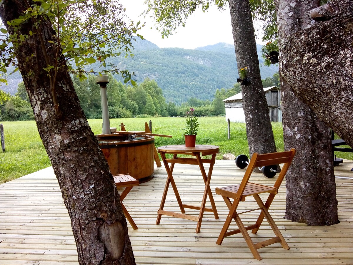 Ξυλόσπιτο με βεράντα και τζακούζι ανάμεσα στα δέντρα