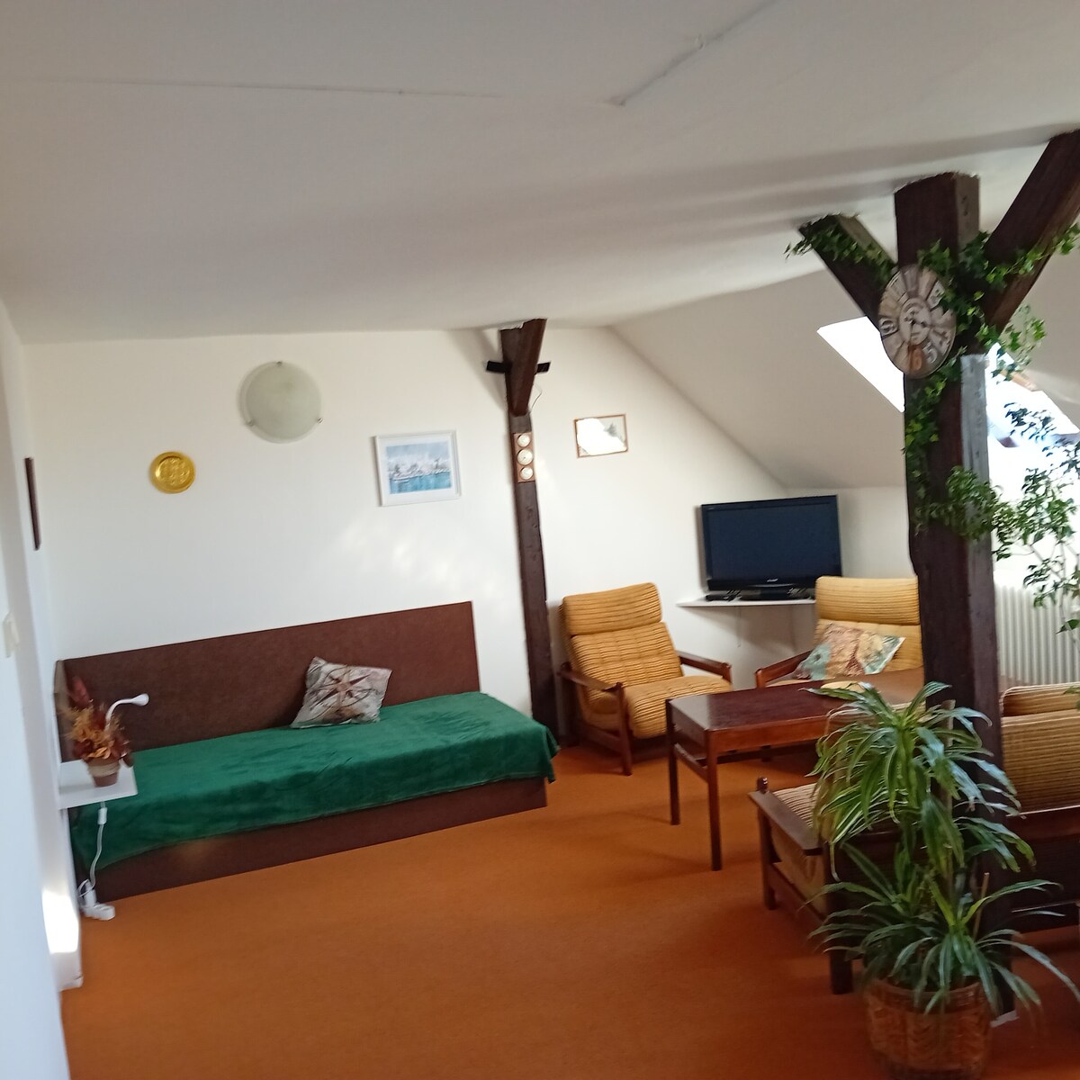 Ubytování v podkroví domu nabízí prostornou ložnici s manželskou postelí a rozkládacím gaučem. V předpokoji je k dispozici kuchyňský kout s rychlovarnou konvicí, mikrovlnkou, lednicí a soukromá toaleta s umyvadlem. Koupelna se sprchových koutem je v přízemí a je sdílená. K dispozoci je veškeré vybavení pro děti. Domácí mazlíčky je možné ubytovat po dohodě, jelikož máme kočku a malého pejska. Myslíme si, že mazlíčci do postele nepatří. Po dohodě je možnost využít venkovní terasu a gril.