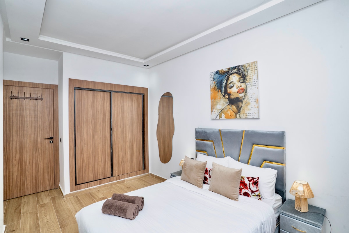 Ψάχνετε ένα ήσυχο και μοντέρνο κατάλυμα στο Μαρακές; Αυτό το στούντιο 60 τ.μ. στην καρδιά του Γκουελίζ είναι ιδανικό για 2 επισκέπτες. • Τοποθεσία: 1 λεπτό από τον σιδηροδρομικό σταθμό, 3 λεπτά από τη λεωφόρο Μ, 5 λεπτά από το αεροδρόμιο, 8 λεπτά από το Τζαμάα Ελ Φνα. • Χωρητικότητα: Κρεβάτι queen size • Σαλόνι: HDTV + Wi-Fi. • Κουζίνα: Πλήρως εξοπλισμένη • Βεράντα: Κοινόχρηστη πισίνα στον τελευταίο όροφο με πανοραμική θέα στη Λεωφόρο Μ.
