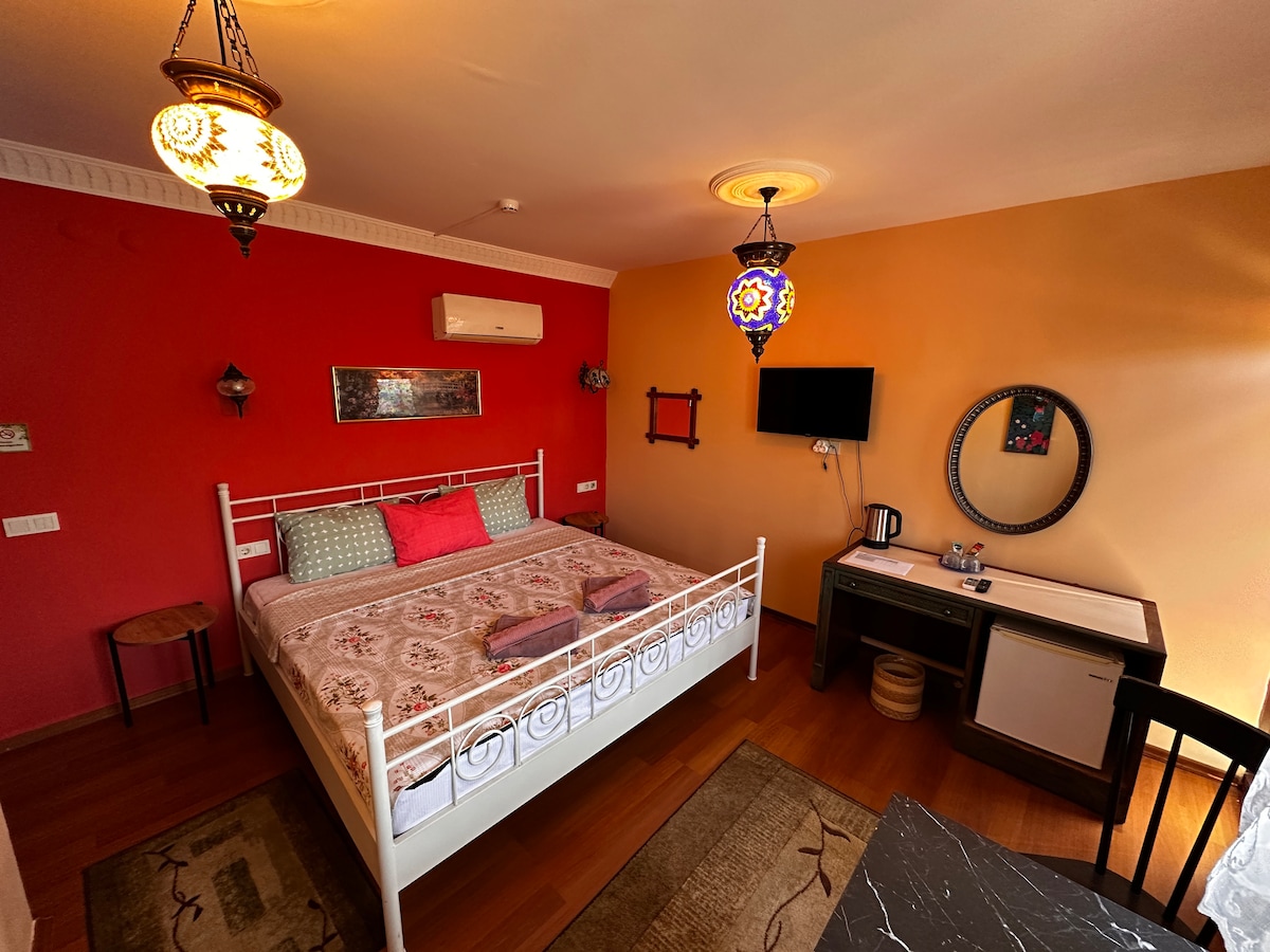 A 200 years old, two floor house. There is a stone wall living room downstairs. 2 double bedroom and one single bedroom is situated on the second floor along with bathroom and a hall way. The house is looking to the famous Şirince village from like a tophill and yet all the amenities of the village is in short walk distance. U r entering the house through a garden. U can as well enjoy the serenity of our garden and benefit our mostly home made beverages that we serve at our cafe