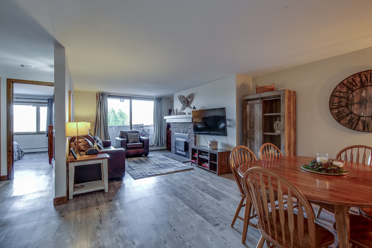 Άνετο ορεινό διαμέρισμα με σκι, με τζάκι από πραγματικό ξύλο και κρεβάτι king size στο Sunrise Village στο Killington Mountain. Οι ανακαινίσεις περιλαμβάνουν όλα τα νέα έπιπλα στο κύριο υπνοδωμάτιο και το υπνοδωμάτιο των επισκεπτών, όλες τις νέες κορυφαίες συσκευές από ανοξείδωτο χάλυβα στην κουζίνα για γκουρμέ, το καλαίσθητα διακοσμημένο σαλόνι με νέο καναπέ-κρεβάτι queen size και ταιριαστές καρέκλες. Απλά περπατήστε μέχρι το τέλος του χώρου στάθμευσης μέχρι το μονοπάτι Ski On/Off. Είμαι ιδιοκτήτης της παρακείμενης μονάδας - περισσότερες πληροφορίες παρακάτω.