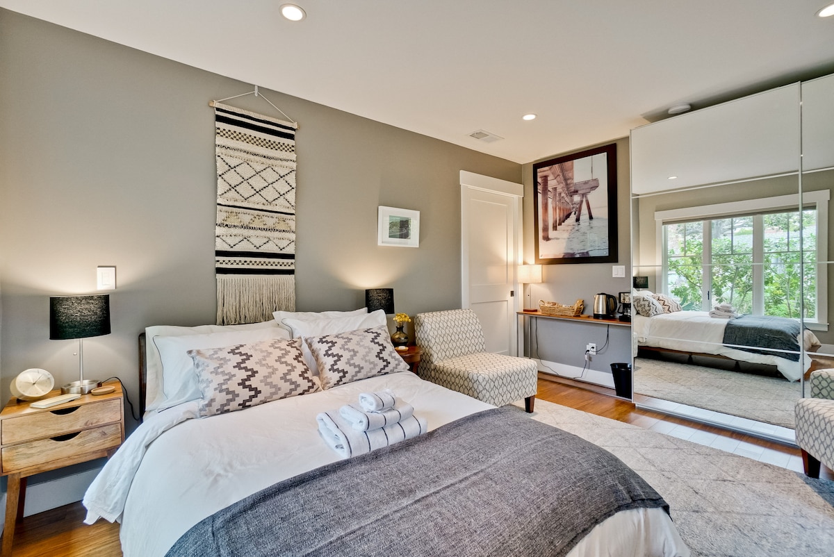 Καθαρό, νεόκτιστο στούντιο με ιδιωτική είσοδο σε κεντρική τοποθεσία σε μια κατοικημένη γειτονιά κοντά στο κέντρο της πόλης Redwood City. Κρεβάτι queen size με πλήρες μπάνιο, κλιματιστικό και ψυγείο/καφέ/φούρνο μικροκυμάτων. Μικρό γραφείο δίπλα στο κρεβάτι, ιδανικό για τηλεργασία ή μελέτη. Εύκολο check-in χωρίς παρουσία οικοδεσπότη με έξυπνη κλειδαριά και εύκολη στάθμευση.