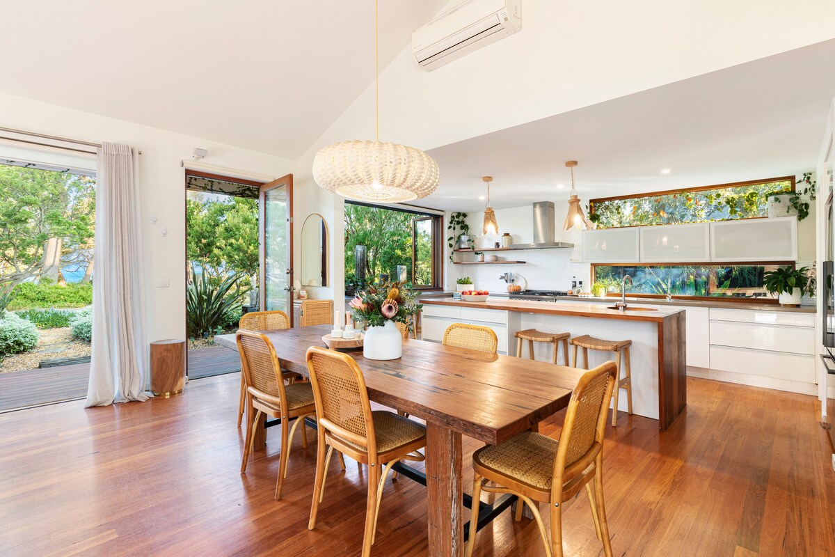 The Rennison is a unique architectural home situated on the shores of Western Port Bay in Newhaven, Phillip Island. Constructed using mud bricks and recycled Tasmanian Oak, this house seamlessly blends with its natural surroundings. The high ceilings and floor-to-ceiling windows allow ample natural light to flood the space, creating a serene and inviting atmosphere.