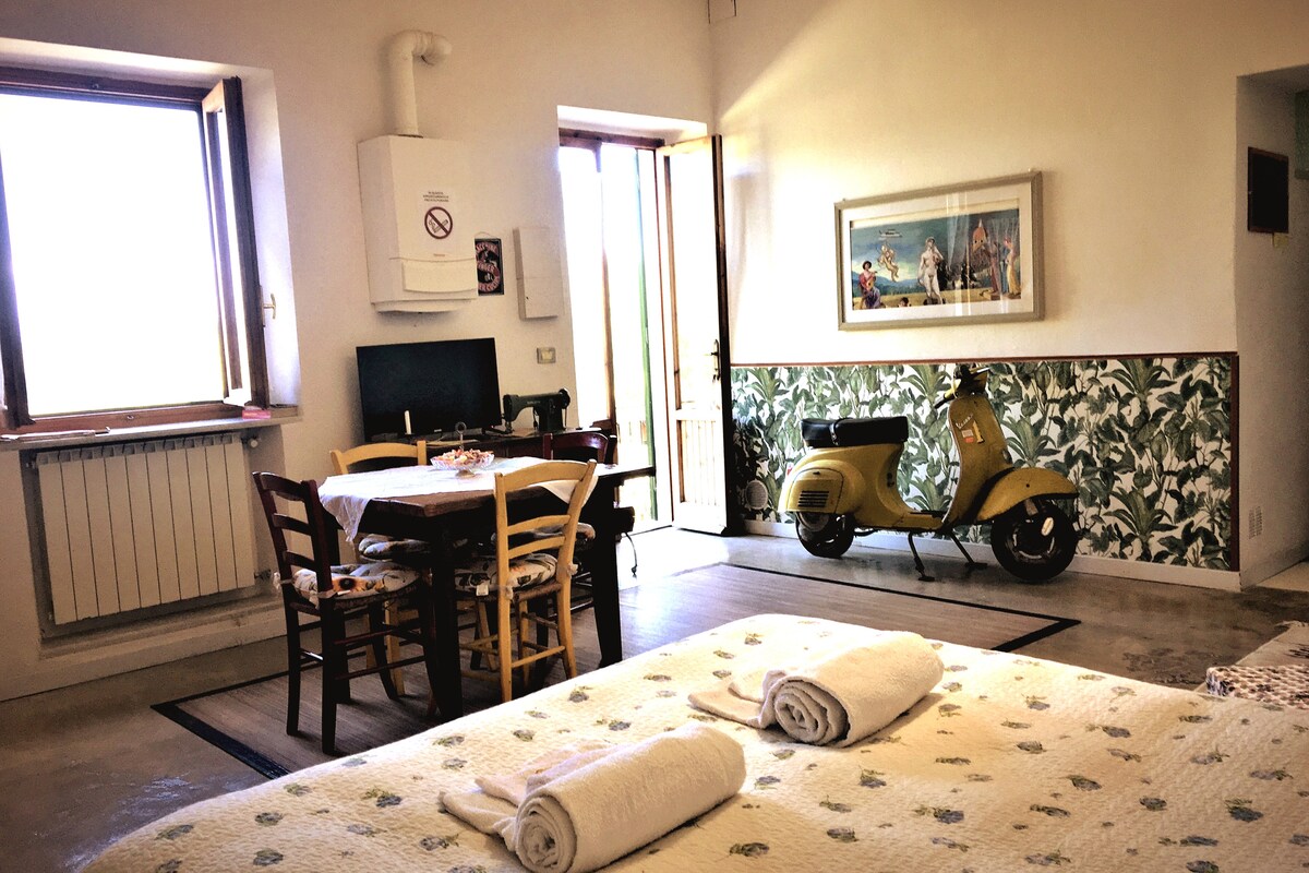 L'appartamento si trova in una grande casa ricoperta di vite americana nel centro della cittadina di Borgo San Lorenzo. L'abitazione è composta da una camera da letto matrimoniale, una cucina e un bagno con doccia. Nella parte esterna c'è un cortile di pietre grigie ed un orto biologico ricco di verdure cresciute con amore e fiori antichi di altri tempi. L'alloggio è per due persone, singole o in coppia, ma c'è anche la possibilità di aggiungere un lettino se ci fosse un bambino presente. La valle del Mugello ha piccoli tesori di rara bellezza: il borgo medievale di Scarperia, le pievi romaniche di Borgo S. Lorenzo, di Sant'Agata e della piccola località di San Giovanni, la casa del pittore Giotto a Vicchio. Le verdi passeggiate nei sentieri dei boschi nell'Appennino tosco-emiliano, il succulento tortello mugellano ripieno di patate, il Lago di Bilancino vicino a Barberino del Mugello. Storia, natura e, se siete appassionati di moto, c'è anche l'autodromo internazionale del Mugello. Ci sono treni e autobus da e per Firenze Dal 1 maggio 2019 all’arrivo sarà richiesto, in contanti, il pagamento dell’imposta di soggiorno dovuta al Comune di Borgo San Lorenzo, pari a euro 1,50 al giorno a persona, fino ad un massimo di 6 giorni consecutivi. From the first day of May the hosts have to pay a tourist tax (for the municipality of Borgo San Lorenzo) when they arrive (with cash money). The tourist tax is 2,00 euro per day each person until the sixth day (from the seventh day is for free).