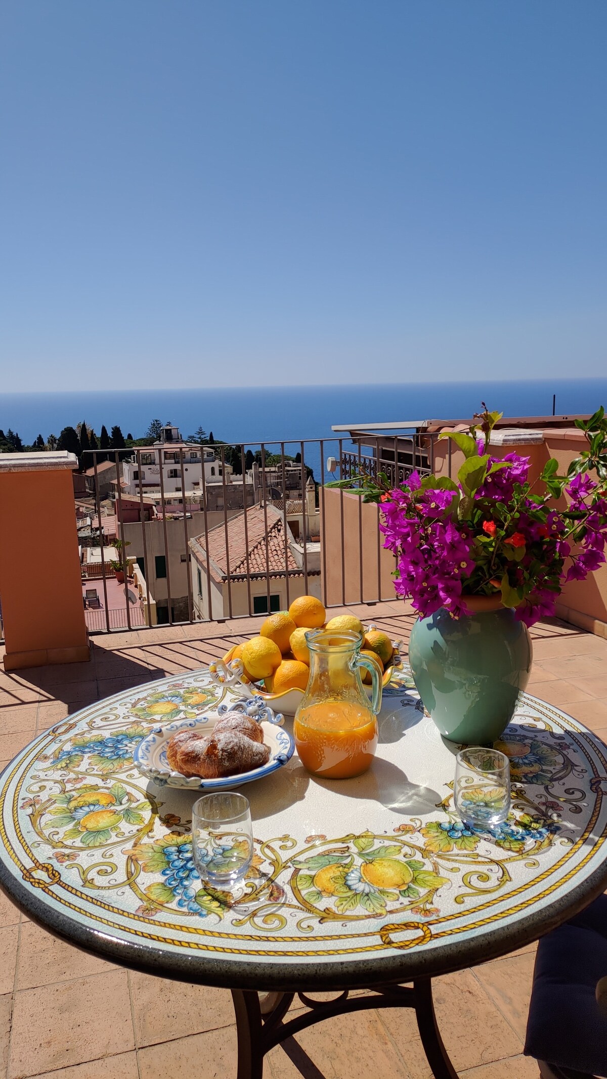QUATTRO FONTANE APARTMENT is one of five apartments located in one separate palazzo on the Main Street of Taormina. We are located in a restricted traffic area (ZTL), detailed parking and access instructions are provided after booking. Two private open terraces: terrace sea view area 26,8 M2 and terrace Via Corso Umberto I view area 29,3 M2 . Max occupancy 2 adults Upper floors accessible by stairs only, no lift. Apartment floor area 22 sq. meters