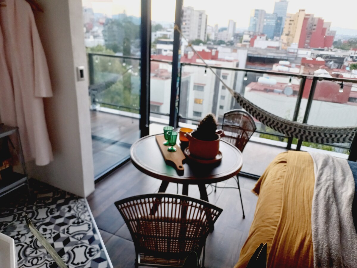 Το πρώτο υπνοδωμάτιο διαθέτει ένα διπλό κρεβάτι, ένα γραφείο και μια ντουλάπα. Το δεύτερο υπνοδωμάτιο διαθέτει κλιματισμό, ένα υπέρδιπλο κρεβάτι και μια ντουλάπα. Η κουζίνα και το σαλόνι, με ασιατικό σχεδιασμό και εξοπλισμένα με ψησταριά, ψυγείο και φούρνο μικροκυμάτων, περιβάλλονται από τη μεγάλη βεράντα. Βρίσκεται στον τρίτο όροφο ενός κομψά ανακαινισμένου κτιρίου Porfirian στη Roma Norte. Πρόσβαση από μια κρυφή σκάλα που οδηγεί σε μια όαση ηρεμίας. Στο εσωτερικό υπάρχουν δύο υπνοδωμάτια και ένα πλήρως εξοπλισμένο μπάνιο.