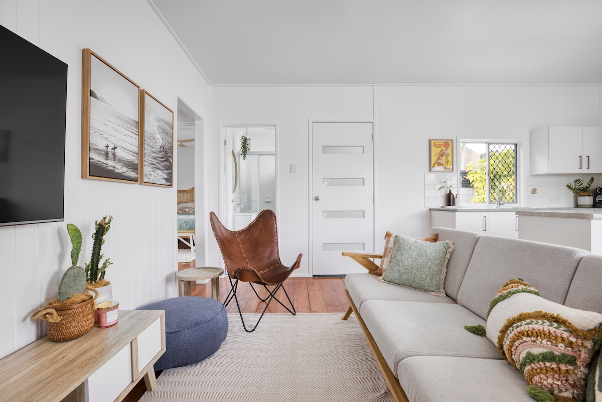Your detached studio accommodation is located at the rear of the property with its own private lockable entry. It is renovated with a modern bathroom and mini kitchenette with all you need for your stay. The king size bed accommodates a couple or can be split for a twin share. Tea/coffee, towels and other small essentials included. The main residence is a restored original 1960's beach cottage. The private gated property is only a short stroll to patrolled surf beaches and Nobby Beach shops.