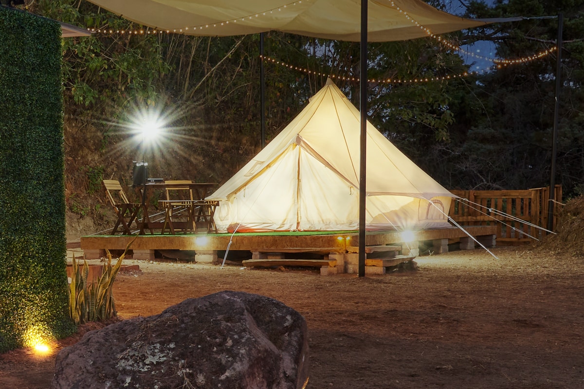 Enjoy an elevated glamping experience in Pátzcuaro, where comfort meets nature and tradition. This VIP bell tent offers a more exclusive setting, ideal for couples seeking added privacy and relaxation. It features a queen bed, enhanced interior amenities, and a carefully curated atmosphere inspired by local cultural identity. Shared outdoor areas include a fire pit, open cinema, and green spaces, along with clean and functional communal bathrooms, all within a peaceful and authentic environment.