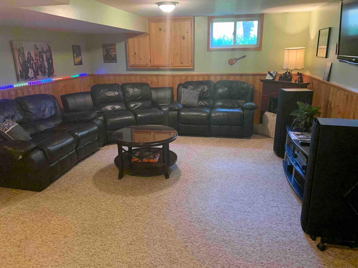Ανακαινίσαμε πρόσφατα το υπόγειό μας για να δημιουργήσουμε μια κομψή, μοντέρνα, άνετη και ήσυχη σουίτα επισκεπτών. Υπάρχει μια πλαϊνή είσοδος που ανοίγει απευθείας σε σκάλες που σας οδηγούν κάτω στο κατάλυμα. Διαθέτει μεταλλική εξωτερική πόρτα που κλειδώνει για ηχομόνωση και ασφάλεια. Το κατάλυμα είναι ένα φωτεινό στούντιο με τρία μεγάλα παράθυρα, πλήρη κουζίνα, καθιστικό με τηλεόραση και τζάκι, τραπεζαρία, κρεβάτι queen size, ντουλάπα και το δικό σας ιδιωτικό μπάνιο με ντους πέντε ποδιών. Με εκτεταμένη ηχομόνωση!
