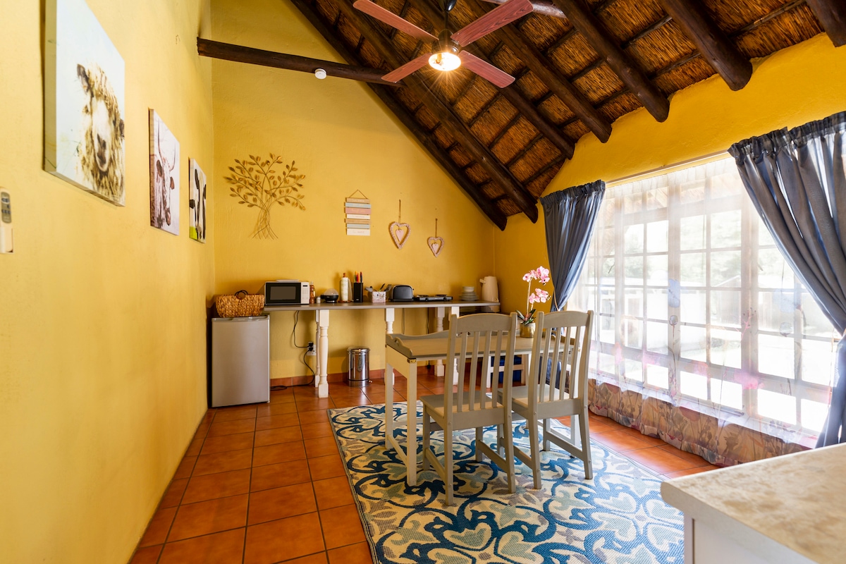 Rambling Rose is a double storey thatch cottage with its own picturesque garden which includes an outdoor seating area with a Weber braai. Positioned in Irene village, the cottage has a warm cozy ambiance. The ground floor ceiling & beams are made out of thick slices of old African hardwood railway sleepers. Netflix, uncapped WIFI on fibre, all included.