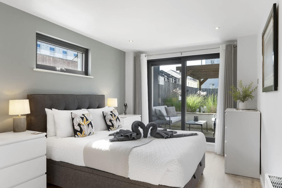 Luxury and convenience come together at this modern apartment in central Plymouth, finished to a high spec throughout. The master bedroom features a king bed with ensuite and walk-in shower, while the second has a double sofa bed with a family bathroom adjacent. The open-plan kitchen, dining and living area is fully equipped, with sliding doors from both bedrooms and living space opening to a private patio with seating. Enjoy a larger communal outdoor area and secure underground parking.