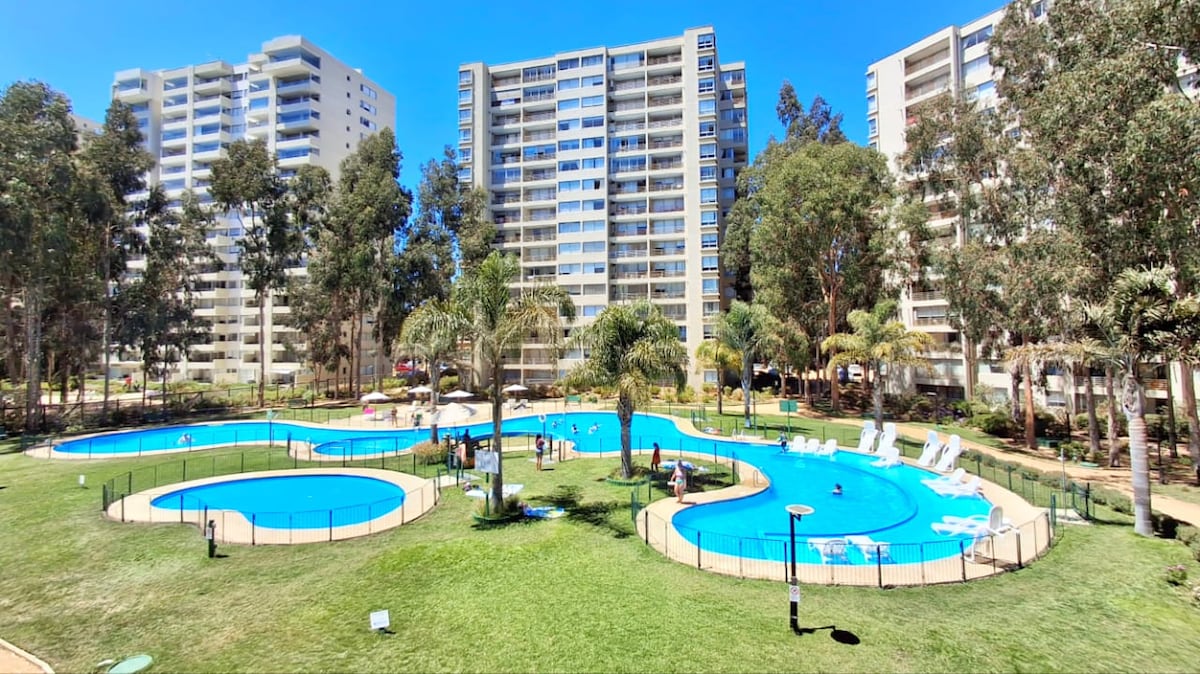 Toallas y Sabanas no incluidas, por higiene Estacionamiento Subterraneo. Depto de 2 Dormitorios con IPTV con Full Canales HD - Mallas de Seguridad - Wifi Fibra Optica. Agua Purificada Hola! Nuestro depto consta de 2 dormitorios y está ubicado en un segundo piso con vista libre a la nueva piscina de la laguna ( mucho más tranquila). Depto muy tranquilo ya que está separado de las otras 5 torres. Es especial para familias con niños pequeños por la cercanía visual con el área de la piscina