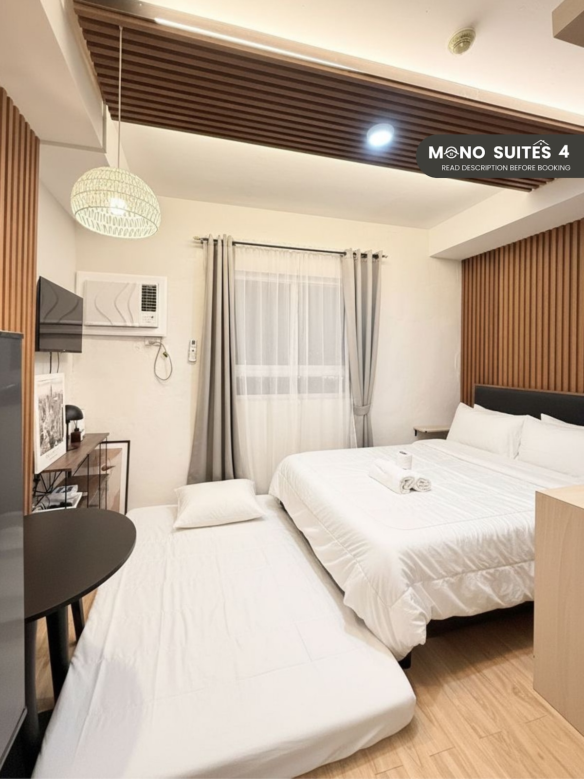 Καλά διατηρημένο στούντιο (για 3 άτομα) στην καρδιά της πόλης κοντά στο εμπορικό κέντρο Ayala Centrio. Στον 4ο όροφο με κρεβάτι μεγέθους KING και καναπέ-κρεβάτι. Εξοπλισμένο με Wi-Fi υψηλής ταχύτητας (200mbps) Globe Parafiber, Smart TV και Netflix. Πλήρες μπάνιο με μπιντέ, πετσέτες ποιότητας ξενοδοχείου, αφρόλουτρο και σαμπουάν. Πλήρης κουζίνα με πλήρη σκεύη και ΔΩΡΕΑΝ ένα γαλόνι πόσιμου νερού. Με θέα την υπέροχη πισίνα (πισίνα για ενήλικες και παιδιά). Σε κοντινή απόσταση υπάρχουν καταστήματα τροφίμων, πλυντήρια, 24ωρο παντοπωλείο και μπαρ. Κάντε κράτηση τώρα🎖️