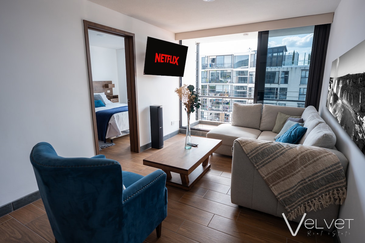 Relájate en este espacio tan tranquilo y elegante. Disfruta de una experiencia con estilo en este alojamiento en la mejor area de la ciudad, a pocos metros del aeropuerto. Con un balcon con jacuzzi y chimenea, nuestra suite de lujo tiene una vista impresionante a la ciudad. Es una muy buena opcion para ti para quedarte, tiene un estilo moderno, area para home office, nunca te aburriras mientras trabajas, conocelo!!