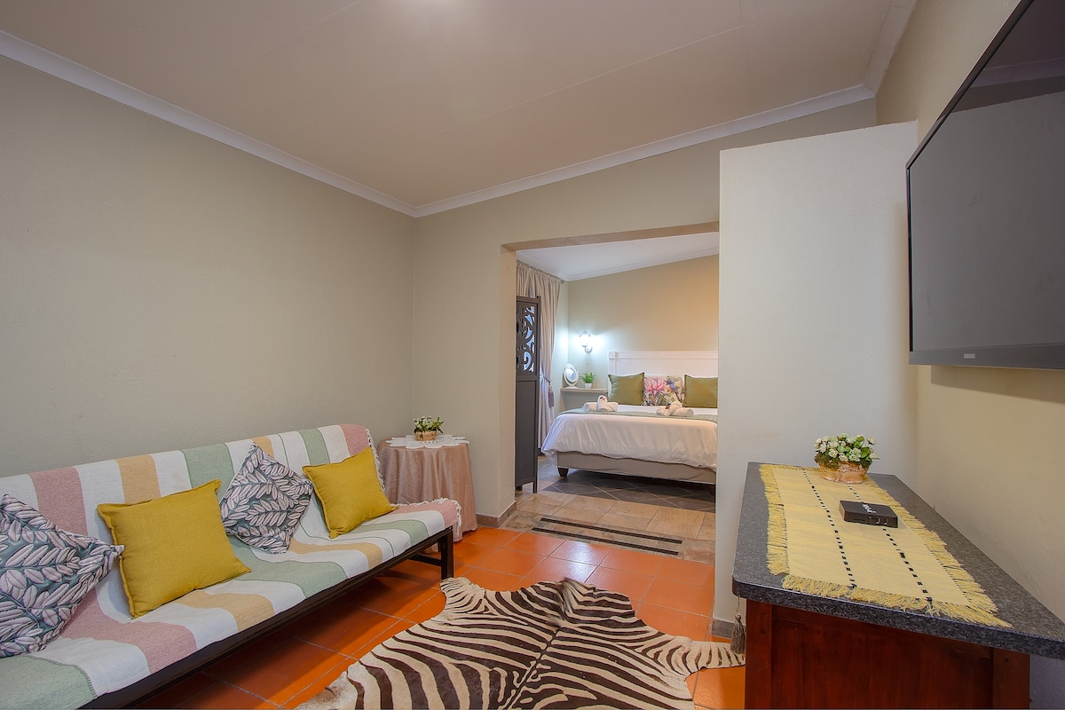 A spacious self-catering garden apartment designed for comfort and relaxation in Komatipoort. The apartment offers a separate bedroom with queen bed, an additional sleeper couch are for 2 guests (children under 12), a full kitchen with gas stove and electric oven, and a bathroom with shower. The kitchen also includes a built-in reverse osmosis water purification system providing clean drinking water. Guests can enjoy meals on the patio braai area.