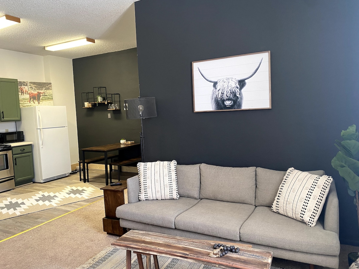Recently renovated, fully furnished 1 bedroom with a twin and queen bed, full kitchen, wifi, AC, heat, city water, and front loader washer/dryer, nice living room, convenient location across the street from the college. Cabin feel with wood paneling/quartz countertops/ensuite washer/dryer. Wifi & DishTV. Certain units allow for a pet but you must call for confirmation on this & obtain details on the total fee, which is dependent on your unit & length of stay and type of pet.