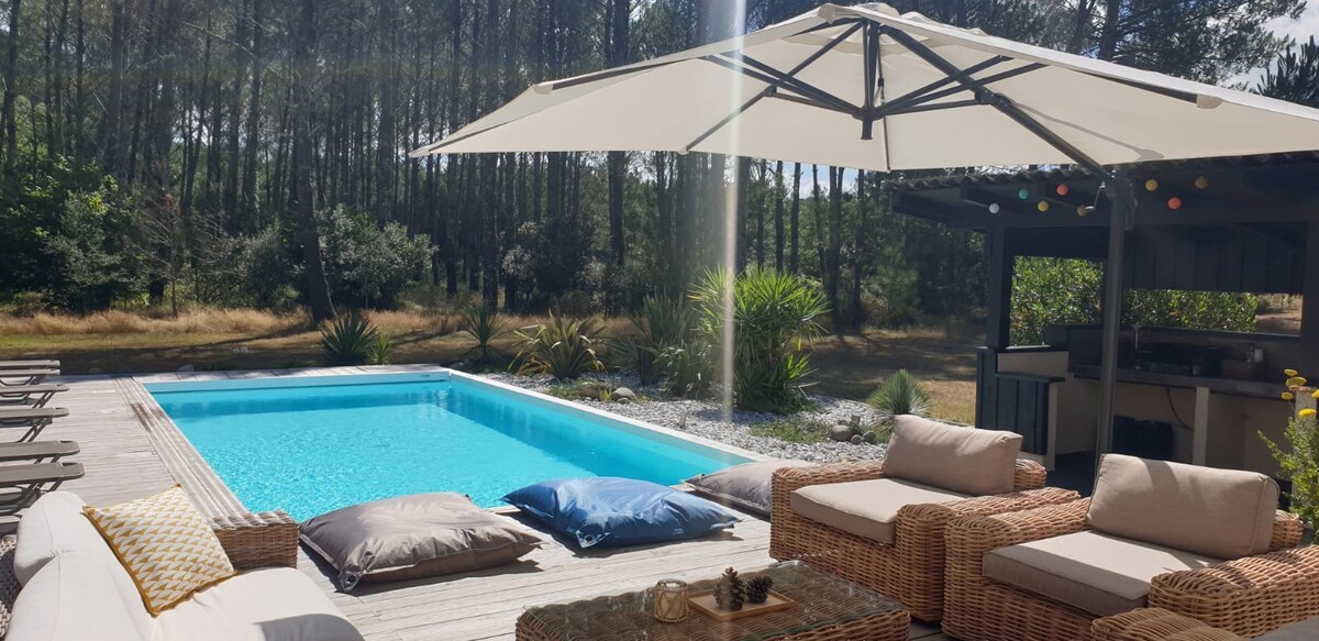 Between ocean and forest: welcome to Villa Leontine. An exceptional location, peaceful with a view of the rejuvenating forest. Just 5 minutes from the beach by car or 10 minutes by bike (8 adult bikes and 2 children's bikes included in the rental), the ocean is on your doorstep. Swimming pool, volleyball court, large outdoor sofas, plancha grill – everything you need to enjoy outdoor living. Inside, all the necessary comforts are also provided: 5 bedrooms, 2 bathrooms, 1 shower room, A/C...