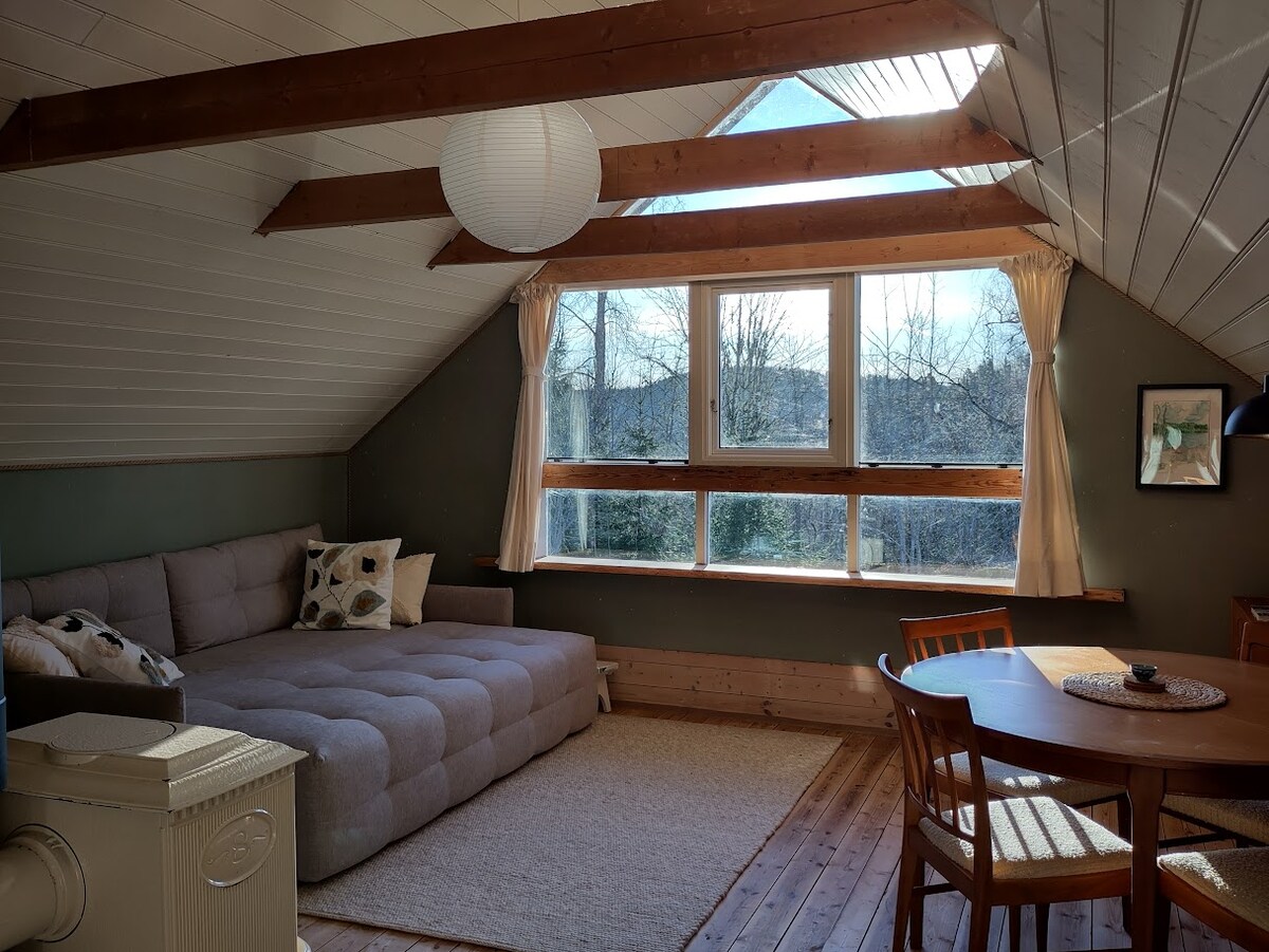Rymligt loft med vedkamin, lugnt och lantligt läge