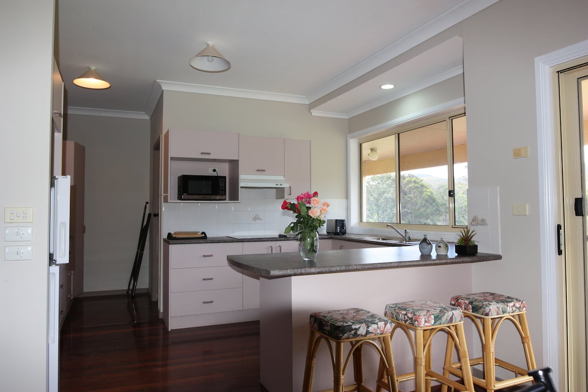 Η δική σας είσοδος σε ένα ευρύχωρο σαλόνι/τραπεζαρία, καλά εξοπλισμένη κουζίνα, μεγάλο υπνοδωμάτιο με ρόμπα και ιδιωτικό μπάνιο. Ένα ηλιόλουστο μπαλκόνι με θέα στο δάσος είναι ιδανικό για πρωινό ή απογευματινό ποτό. Πισίνα με θαλασσινό νερό και κοινόχρηστο πλυντήριο. Το χωριό Tinonee απέχει 5 λεπτά από τον αυτοκινητόδρομο και έχει μια ήσυχη αίσθηση εξοχής. Περίπου 700 μέτρα ασφράγιστος δρόμος σας φέρνει στην ιδιοκτησία μας των 10 στρεμμάτων. Σε 12 λεπτά μπορείτε να είστε στο Taree. 20-30 λεπτά σας μεταφέρουν σε αρκετές τοπικές παραλίες ή κάντε μια δασική βόλτα στην ενδοχώρα.