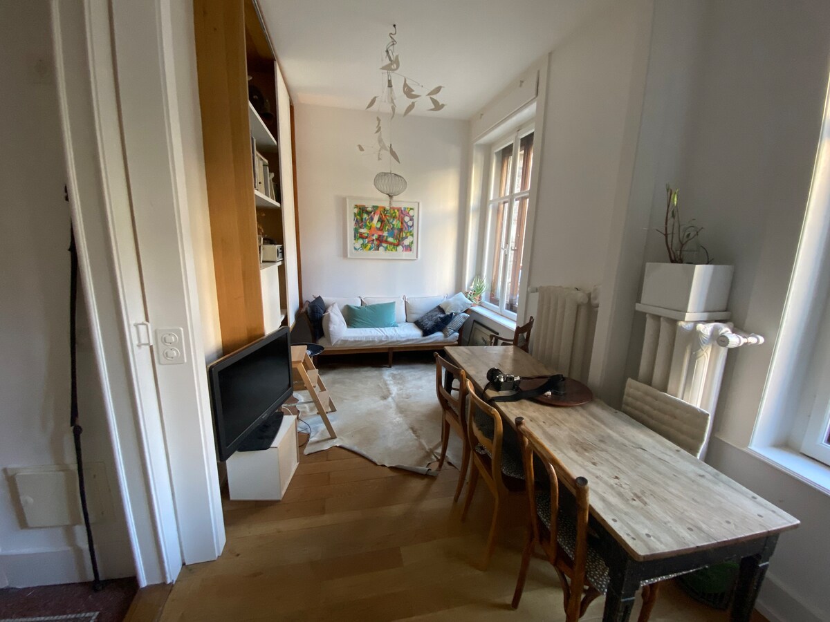 Αυτό το μοναδικό, γεμάτο τέχνη διαμέρισμα βρίσκεται σε ένα διατηρητέο κτίριο του 1939 δίπλα στο πάρκο Mon Repos, 2 λεπτά από το μετρό και το κέντρο. Θα απολαύσετε 100 τ.μ. ιδιωτικού χώρου (5,5 δωμάτια συνολικά, 135 τ.μ.). Συνήθως μένω εδώ, αλλά θα λείπω: θα έχετε πλήρη ιδιωτικότητα. Ένα υπνοδωμάτιο παραμένει κλειστό για ομάδες κάτω των 6 ατόμων, εκτός αν χρειαστεί. Αν χρειάζεστε περισσότερη άνεση σε ξεχωριστά δωμάτια (π.χ. 2 επισκέπτες σε 2 κρεβάτια ή 3 σε 3), θα το ανοίξω για 40 CHF/διανυκτέρευση. Όλοι είναι ευπρόσδεκτοι, από όπου κι αν είστε, ό,τι κι αν πιστεύετε, όποιον κι αν αγαπάτε.