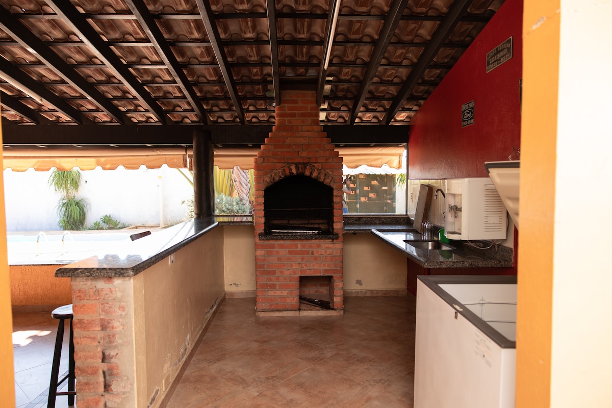 O espaço está localizado em uma região central próximo a supermercados, bancos, bares e avenidas movimentadas, porém com toda a tranquilidade de um bairro seguro e calmo. ATENÇÃO: a propriedade conta com 3 quartos sendo: 01 Suíte 01 quarto com cama de casal 01 quarto com 2 camas de solteiro; 01 colchão inflável. 02 banheiros externos anexos aos dois quartos além do banheiro suíte. 01 salão com meda e cadeiras anexo à área gourmet.
